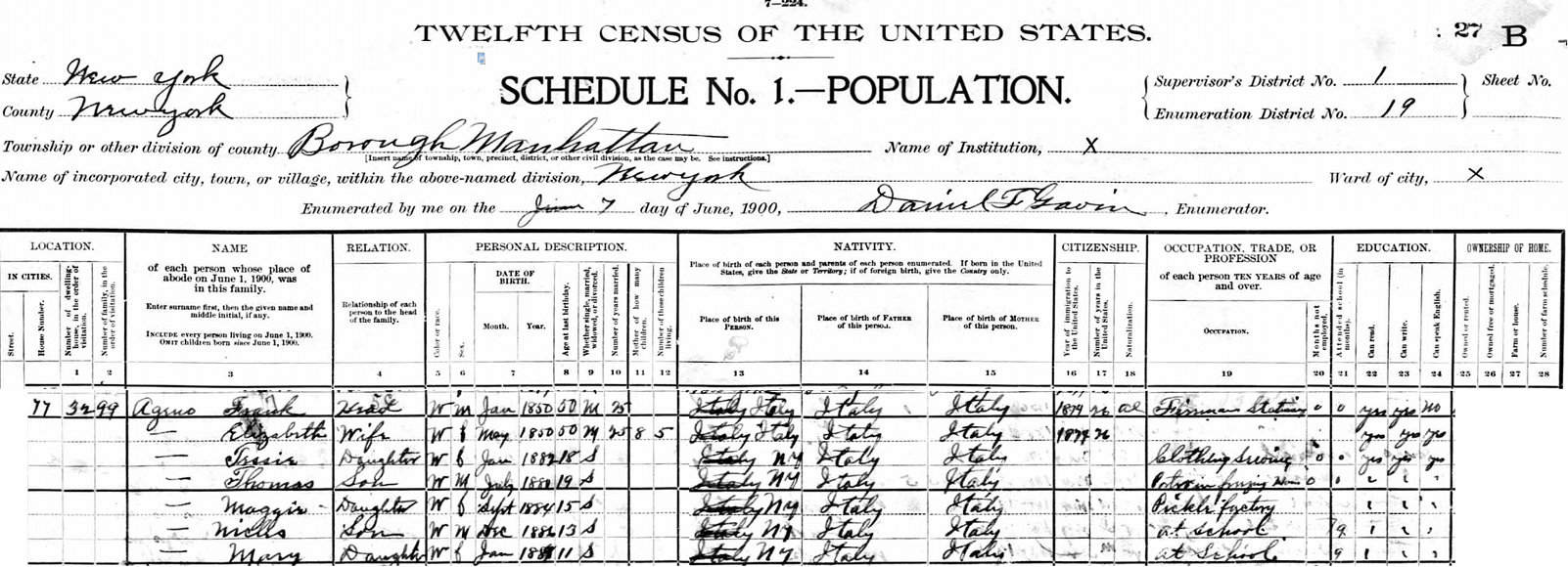 Frank is a mystery. A search of the major genealogy sites for Gazzanese shows only Thomas and his family. They are shown in the 1910 census. In the 1900 census above he was Frank Ageno living at 77 Oliver St in Manhatten. The 1910 census did list Frank Gardinisa as head of household at 15 JOHN ST , West Orange, NJ. He was 53. Born in Italy and married to Elizabeth for 30 years. Works as a liveryman at the Edison factory. Owns his home. (Mortgaged). Can read, write and speak English. Elizabeth is 49. Had eight children. Five are still alive. The children were Margaret, Mary, Nicholas, Teresa and Thomas. Mary, 19, was the only child living there. Her husband Patrick Romano, 22, also lived there. Patrick arrived in the USA in 1902 and owned a grocery store around the corner from the house. The 1908 City Directory had Frank Gazanie employed by Edison.