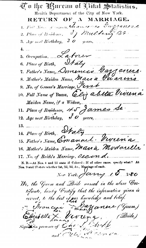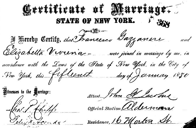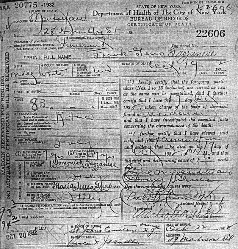 The 1910 census showed Thomas Gazzanese living in Brooklyn in Ward 22. He was born in 1882 in NYC. Wife Linda was born in 1884 in Italy. Arrived in the USA in 1898. Children: Gilda born 1903, Eugene 1905, Ada A. 1908, Albert newborn.