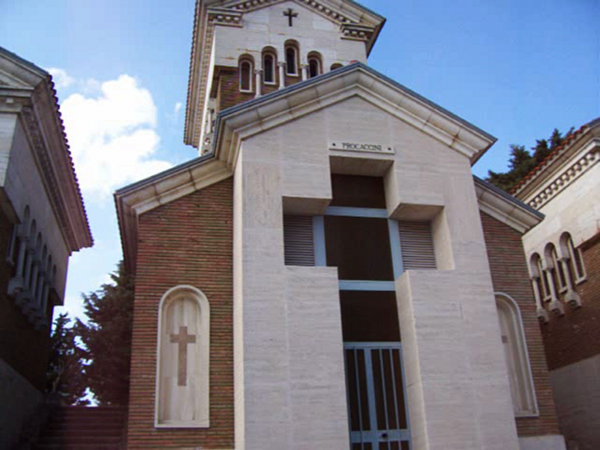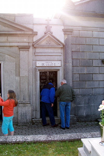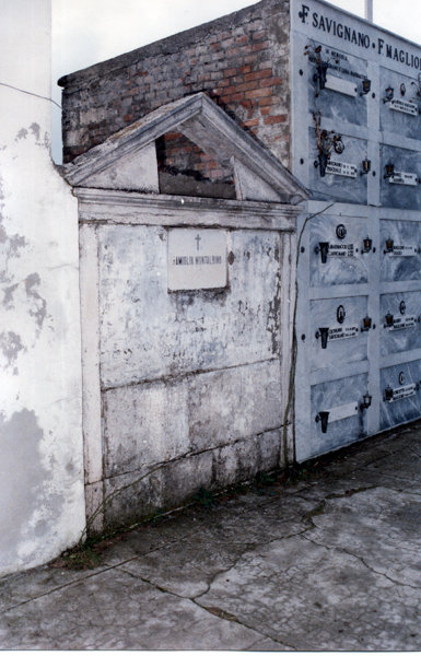 The first photo was taken in 1985 and shows the Montalbino crypt with the name engraved. By 1987, when we visited, this crypt had been sold by our cousin and that end of the cemetery remodeled. The name was moved inside and placed on the wall over a grate that opened to the room underneath. This room contained three metal boxes that contained the remains of Nazareno, Francesca and Seletta. Louis died in Savignano in 1922 and was buried there until he was moved to Brooklyn. The last picture is how it looked in 2007. Son Marc and I are standing by the door. There is no Montalbino sign inside. Somewhere I have pictures of the 1987 visit I will try and find.